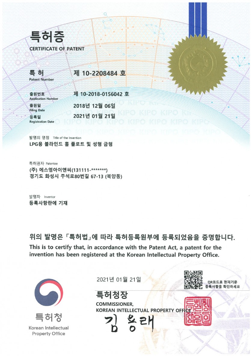 LPG용 블라인드 홀 플로트 및 성형 금형 > 지적재산 및 인증